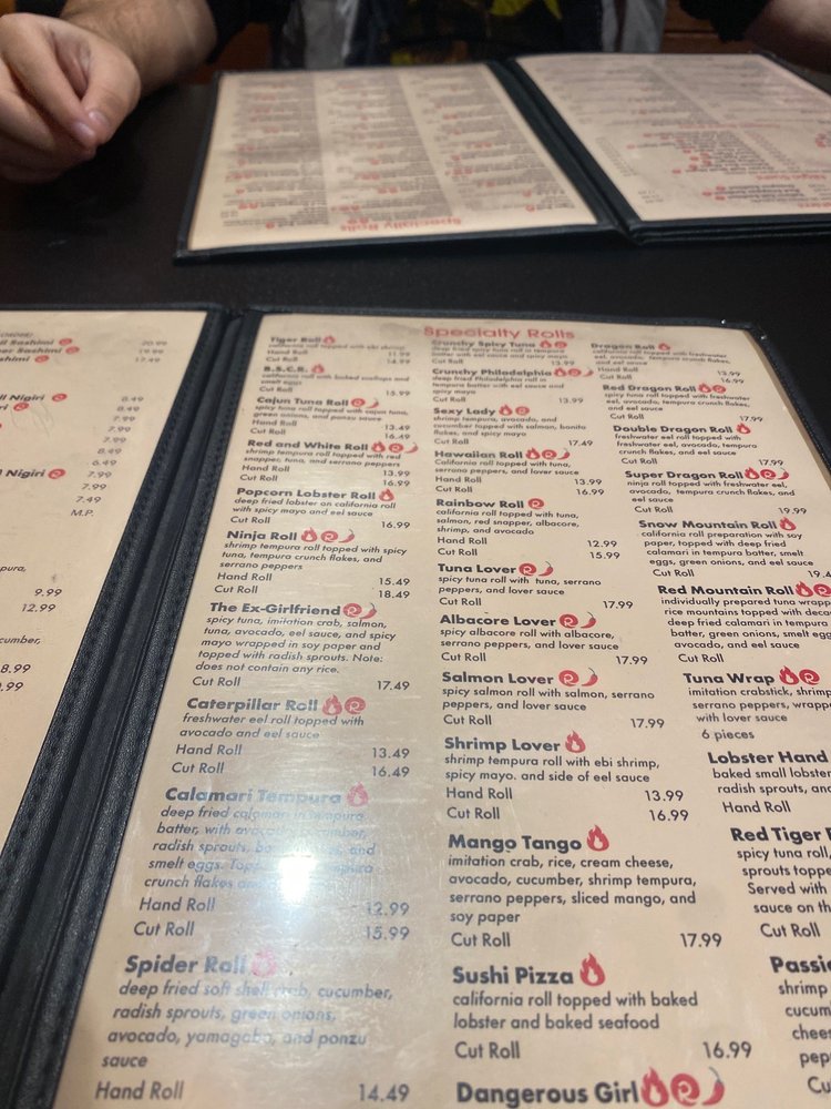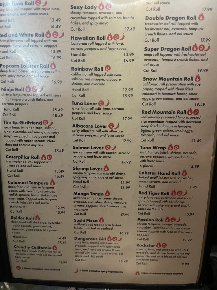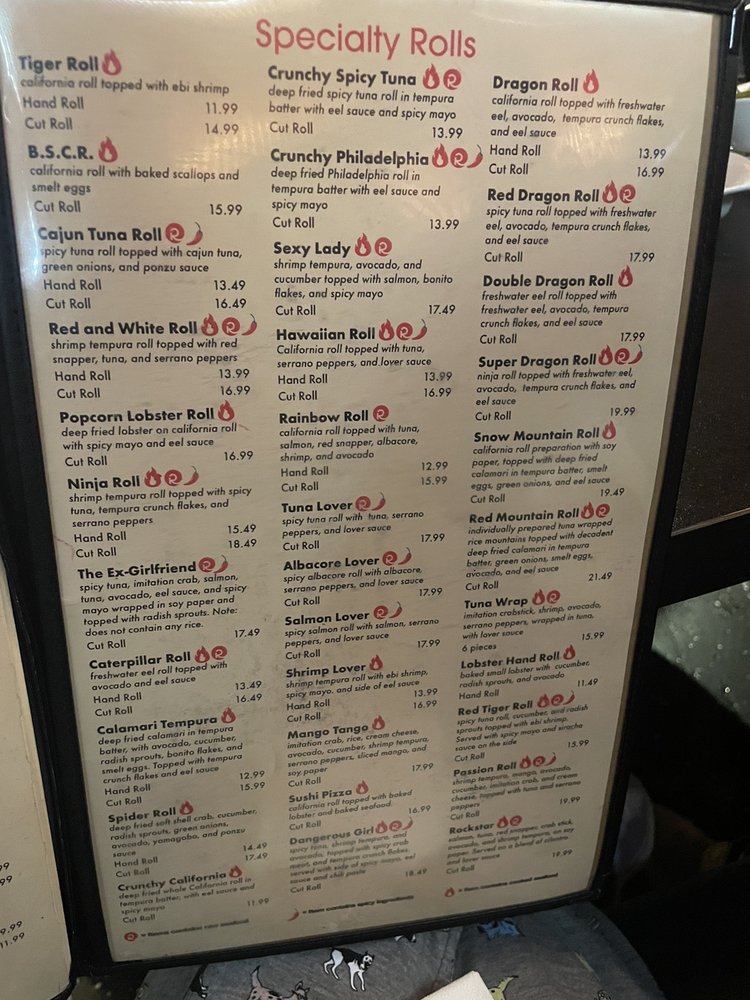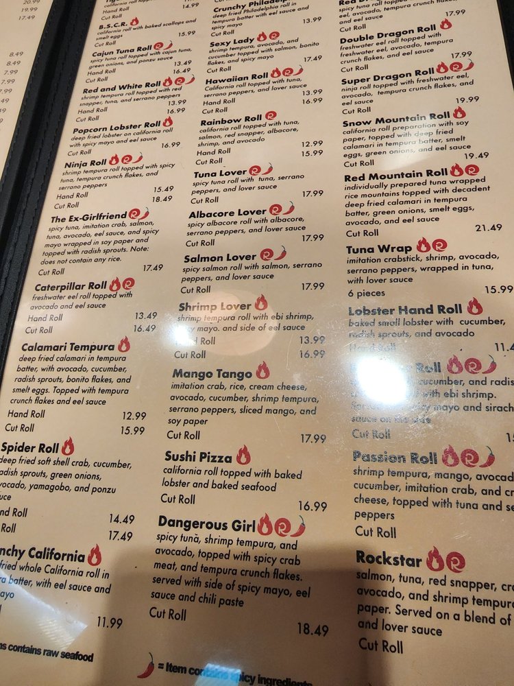 Shrimp tempura, mango, avocado, cucumber, imitation crab, and cream cheese topped with tuna and serrano peppers.